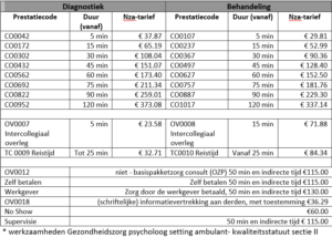Ik hanteer de door de Nederlandse zorgautoriteit (NZa) gestelde tarieven en afhankelijk van de afspraken per verzekeraar krijg ik een bepaald % van dit tarief. Het bedrag wordt verder bepaald door de tijdsduur van het directe contact en het type consult. U zult het precieze bedrag kunnen terug vinden in de afrekening van uw eigen zorgverzekeraar. Dit geldt niet voor: OZP, zelf betalen, supervisie, informatie verstrekking en een no show.
